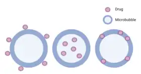Due to their ability to oscillate with exposure to low-frequency ultrasound, microbubbles have been used as contrast agents in order to visualize tissues in which the microbubbles have permeated.[44] However, when these microspheres are exposed to higher pressure ultrasound, they can rupture, which could be beneficial for drug delivery purposes.[44] Through SDT, these microbubbles could be selectively bursted at the tumor microenvironment in order to decrease systemic levels of the encapsulated drug and increase therapeutic efficacy. When applying SDT, the increase in acoustic pressure leads to the inertial cavitation, or collapse of the microbubble and local release of the cargo within. The inertial cavitation of the microbubbles when exposed to SDT is also referred to as ultrasound mediated microbubble destruction (UMMD).[45] The shell of microbubbles can be decorated with different components, including polymers, lipids, or proteins depending on their intended purpose.[44] Microbubbles have also been used for the localized release of attached cargo. This cargo is typically chemotherapeutics, antibiotics, or genes.[12] Different drugs can be directly loaded into the microbubble with methods such as conjugation and nanoparticle, liposome loading, and genes. The combination of genes and SDT is referred to as sonotransfection.[12] Examples of outer shell modifications can be seen in a study by McEwan et al. which found that lipid microbubbles showed reduced stability when sonosensitizers were added to their shells.[44] However, attaching the polymer poly lactic-co-glycolic acid (PLGA) to the shell resulted in increased stability compared to the lipid microbubbles without losing other desirable properties such as targeted delivery and selective cytotoxicity.[44] In another study, McEwan et al. investigated the ability of microbubbles carrying oxygen to increase production of reactive oxygen species, which are a necessary component of SDT, in the hypoxic environment of many solid tumors.[46] These microbubbles were stabilized with lipids and a Rose Bengal sonosensitizer was attached to the surface to treat pancreatic cancer.[46] Their work showed that coupling oxygen-loaded microbubbles that are sensitive to ultrasound with sonosensitizing drugs could allow for increased drug activation at the desired target even if hypoxia is present. Examples of therapeutics that have been loaded into microbubbles are gemcitabine, paclitaxel nanoparticles, plasmid DNA and 2,2′-azobis[2-(2-imidazolin-2-yl)propane]dihydrochloride loaded liposomes.[47][45][48][49] Due to the targeting nature of the ligands connected to the microbubble, it allows for the controlled and specific targeting of the desired tissue for treatment. Another study performed by Nesbitt et al. has shown improved tumor reduction when gemcitabine was loaded into the microbubble and applied to a human pancreatic cancer xenograft model with SDT.[48]