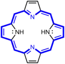 The 18-electron cycle of porphin, the parent structure of porphyrin, highlighted. (Several other choices of atoms, through the pyrrole nitrogens, for example, also give 18-electron cycles.)