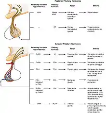 The formation of primary spermatocytes (a process known as spermatocytogenesis) begins in humans when a male is sexually matured at puberty, around the age of 10 through 14.[7] Formation is initiated upon the pulsated surges of gonadotropin-releasing hormone (GnRH) from the hypothalamus, which leads to the secretion of follicle-stimulating hormone (FSH) and luteinizing hormone (LH) produced by the anterior pituitary gland. The release of FSH into the testes will enhance spermatogenesis and lead to the development of Sertoli cells, which act as nursing cells where spermatids will go to mature after meiosis II. LH promotes Leydig cell secretion of testosterone into the testes and blood, which induce spermatogenesis and aid the formation of secondary sex characteristics. From this point on, the secretion of FSH and LH (inducing production of testosterone) will stimulate spermatogenesis until the male dies.[8] Increasing the hormones FSH and LH in males will not increase the rate of spermatogenesis. However, with age, the rate of production will decrease, even when the amount of hormone that is secreted is constant; this is due to higher rates of degeneration of germ cells during meiotic prophase.[1]