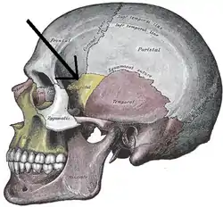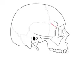 ![]() Side view of the skull. (Sphenofrontal suture visible at center, between sphenoid bone, which is colored yellow in the diagram, and the frontal bone, which is colored in gray, and is at the upper left.). | |