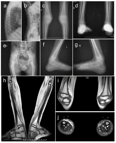 a-j)X-ray radiography and leg muscle MRI of the proband (SMALED1)