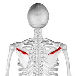 The root of the spine of the scapula is the most medial part of the scapular spine. It is termed "triangular area of the spine of scapula", based on its triangular shape giving it distinguishable visible shape on x-ray images.[1] The root of the spine is on a level with the tip of the spinous process of the third thoracic vertebra.[2]