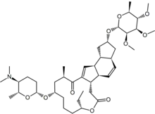 The bacteria produce yellowish-pink aerial hyphae, with bead-like chains of spores enclosed in a characteristic hairy sheath.[11] This genus is defined as aerobic, Gram-positive, nonacid-fast actinomycetes with fragmenting substrate mycelium. S. spinosa was isolated from soil collected inside a nonoperational sugar mill rum still in the Virgin Islands. Spinosad is a mixture of chemical compounds in the spinosyn family that has a generalized structure consisting of a unique tetracyclic ring system attached to an amino sugar (D-forosamine) and a neutral sugar (tri-Ο-methyl-L-rhamnose).[4] Spinosad is relatively nonpolar and not easily dissolved in water.[12] Spinosad is an insecticide derived from a family of natural products obtained by fermentation of S. spinosa. Spinosyns occur in over 20 natural forms, and over 200 synthetic forms (spinosoids) have been produced in the lab.[10] Spinosad contains a mix of two spinosoids, spinosyn A, the major component, and spinosyn D (the minor component), in a roughly 17:3 ratio.[11]
