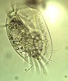 The spirotrichs are a large and diverse group of ciliate protozoa.[3] They typically have prominent oral cilia in the form of a series of polykinetids, called the adoral zone of membranelles, beginning anterior to the oral cavity and running down to the left side of the mouth. There may also be one or two paroral membranes on its right side. The body cilia are fused to form polykinetids called cirri in some, and are sparse to absent in others.