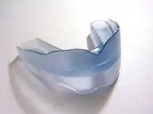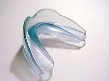 The device is made from flexible material as one single piece. At its center, it is completely even and approximates the shape of an ideal dental arch. This flat part is surrounded by ramp-shaped walls. The teeth of the upper and lower jaw bite into the space between these walls accordingly. Normally, there are no individual tooth slots, with the prominent exception of the Australian Myobrace design.