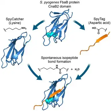 - ↑ Liu Y, Liu D, Yang W, Wu XL, Lai L, Zhang WB (September 2017). "Tuning SpyTag-SpyCatcher mutant pairs toward orthogonal reactivity encryption". Chemical Science. 8 (9): 6577–6582. doi:10.1039/C7SC02686B. PMC 5627348. PMID 28989685.
