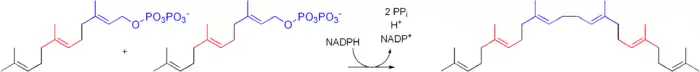 Squalene is biosynthesised by coupling two molecules of farnesyl pyrophosphate. The condensation requires NADPH and the enzyme squalene synthase.