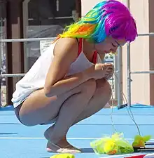 Crouching is usually considered to be synonymous with squatting. It is common to squat with one leg and kneel with the other leg.[1] One or both heels may be up when squatting. Young children often instinctively squat. Among Chinese, Southeast Asian and Eastern European adults, squatting often takes the place of sitting or standing.[2]