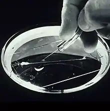 The squid giant axon is the very large (up to 1.5 mm in diameter; typically around 0.5 mm) axon that controls part of the water jet propulsion system in squid. It was first described by L. W. Williams[1] in 1909,[2] but this discovery was forgotten until English zoologist and neurophysiologist J. Z. Young demonstrated the axon's function in the 1930s while working in the Stazione Zoologica in Naples, the Marine Biological Association in Plymouth and the Marine Biological Laboratory in Woods Hole.[3][4] Squids use this system primarily for making brief but very fast movements through the water.