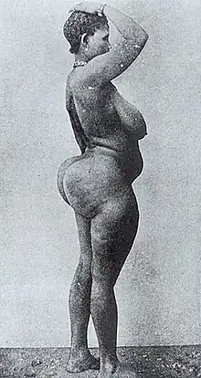 In Georgian England, freak shows were known to have exploited a woman with steatopygia at least once. The most well-known example was a South African Khoikhoi woman named Saartjie Baartman,[7] who is thought to have had lipedema.[8]