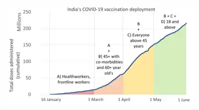 451. Sinha, Smriti, ed. (14 May 2021). "India has administered nearly 180mn Covid vaccine doses till now". Hindustan Times. Archived from the original on 14 May 2021. Retrieved 14 May 2021.