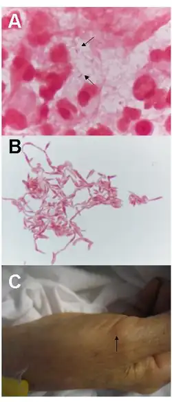 - 1 2 3 4 5 6 Woo, Patrick (2014). "Streptobacillus hongkongensis sp. nov., Isolated from Patients with Quinsy and Septic Arthritis, and Emended Descriptions of the Genus Streptobacillus and Streptobacillus moniliformis". International Journal of Systematic and Evolutionary Microbiology. 64 (Pt 9): 3034–3039. doi:10.1099/ijs.0.061242-0. PMID 24912824.