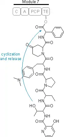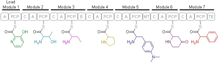 NRPSs contain several modules on a single polypeptide. Each of these modules can catalyze activation, condensation and a modification reaction specific to one kind of amino acid.[2] A typical elongation module consists of an adenylation domain (A), a peptidyl carrier protein domain (PCP) and a condensation domain (C). Some other domains may be present that are responsible for modifications to the residues, such as epimerization domain (E) and N-methyltransferase domain (MT). The domain responsible for the termination is the thioesterase domain (TE) located in the final module.[3]