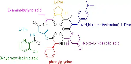 The general amino acid composition of streptogramin B consists of: 3-hydroxypicolinic acid, L-threonine, D-aminobutyric acid, L-proline, 4-N,N-(dimethylamino)-L-phenylalanine, 4-oxo-L-pipecolic acid and phenylglycine.