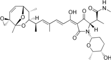 Streptolydigin (Stl) is an antibiotic that works by inhibiting nucleic acid chain elongation by binding to RNA polymerase, thus inhibiting RNA synthesis inside a cell.[1][2][3] Streptolydigin inhibits bacterial RNA polymerase, but not eukaryotic RNA polymerase.[4] It has antibacterial activity against a number of Gram positive bacteria.