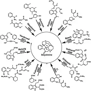 citing Woodward RB, Cava MP, Ollis WD, Hunger A, Daeniker HU, Schenker K (1963). "The Total Synthesis of Strychnine". Tetrahedron. 19: 247–288. doi:10.1016/S0040-4020(01)98529-1. - ↑ Nicolaou KC, Sorensen EJ (1996). Classics in Total Synthesis: Targets, Strategies, Methods. Wiley. ISBN 978-3-527-29231-8.
