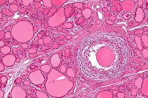 Micrograph showing a granuloma in subacute thyroiditis. H&E stain. | |