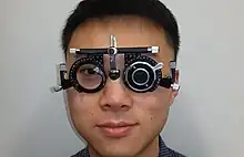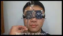 Subjective Refraction is a technique to determine the combination of lenses that will provide the best corrected visual acuity (BCVA).[1] It is a clinical examination used by orthoptists, optometrists and ophthalmologists to determine a patient's need for refractive correction, in the form of glasses or contact lenses. The aim is to improve current unaided vision or vision with current glasses. Glasses must also be comfortable visually. The sharpest final refraction is not always the final script the patient wears comfortably.