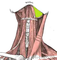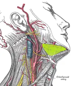 The submandibular space is a fascial space of the head and neck (sometimes also termed fascial spaces or tissue spaces). It is a potential space, and is paired on either side, located on the superficial surface of the mylohyoid muscle between the anterior and posterior bellies of the digastric muscle.[1] The space corresponds to the anatomic region termed the submandibular triangle, part of the anterior triangle of the neck.