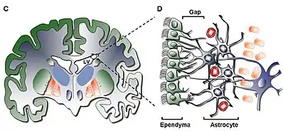 - ↑ Gates, MA; Thomas, LB; Howard, EM; Laywell, ED; Sajin, B; Faissner, A; Götz, B; Silver, J; Steindler, DA (Oct 16, 1995). "Cell and molecular analysis of the developing and adult mouse subventricular zone of the cerebral hemispheres". The Journal of Comparative Neurology. 361 (2): 249–66. doi:10.1002/cne.903610205. PMID 8543661. S2CID 12720709.
