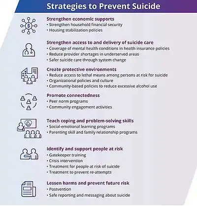 - ↑ "Preventing Suicide | Violence Prevention | Injury Center". www.cdc.gov. 11 September 2019. Retrieved 3 December 2019.