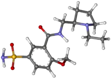 Sulpiride, sold under the brand name Dogmatil among others, is an atypical antipsychotic (although some texts have referred to it as a typical antipsychotic)[10] medication of the benzamide class which is used mainly in the treatment of psychosis associated with schizophrenia and major depressive disorder, and sometimes used in low dosage to treat anxiety and mild depression. Sulpiride is commonly used in Asia, Central America, Europe, South Africa and South America. Levosulpiride is its purified levo-isomer and is sold in India for similar purpose. It is not approved in the United States, Canada, or Australia. The drug is chemically and clinically similar to amisulpride.