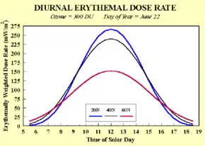 Erythemal dose rate at three Northern latitudes. (Divide by 25 to obtain the UV Index.)