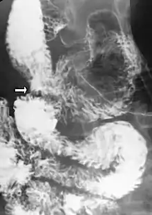 Upper gastrointestinal series showing duodenojejuonostomy (white arrow).