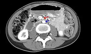 Abdominal and pelvic computed tomography scan showing duodenal compression (black arrow) by the superior mesenteric artery (red arrow) and the abdominal aorta (blue arrow).