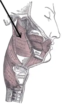 The interval between the upper border of the muscle and the base of the skull is closed by the pharyngeal aponeurosis, and is known as the sinus of Morgagni.[2]