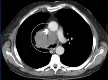 It most commonly occurs due to cancer or blood clot within the blood vessel.[1] The cancers most frequently involved are small cell lung cancer, non-Hodgkins lymphoma, and metastatic tumors.[1] It may also occur as a complication of intravascular devices such as central venous catheters or leads from pacemakers, certain infections such as syphilis, thoracic aneurysms, and fibrosing mediastinitis.[1][2] Diagnosis is generally by medical imaging.[1]