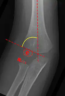 Carrying angle can be evaluated through AP view of the elbow by looking at the Baumann’s angle.[3] There are two definitions of Bowmann's angle: