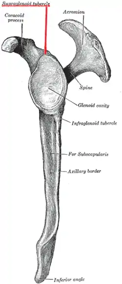 The supraglenoid tubercle is a region of the scapula from which the long head of the biceps brachii muscle originates.[1][2] It is a small, rough projection superior to the glenoid cavity near the base of the coracoid process. The term supraglenoid is from the Latin supra, meaning above, and glenoid, meaning socket or cavity.[3]