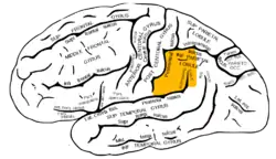 ![]() Lateral surface of left cerebral hemisphere, viewed from the side (supramarginal gyrus shown in orange) | |