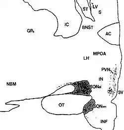 ![]() Human supraoptic nucleus (SON, dorsolateral and ventromedial components) in this coronal section is indicated by the shaded areas. Dots represent vasopressin (AVP) neurons (also seen in the paraventricular nucleus, PVN). The medial surface is the 3rd ventricle (3V), with more lateral to the left. | |