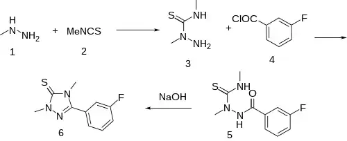 - ↑ Louks, David H.; Stolz-Dunn, Sandra K. (2007). "Kinetics for Scale-Up of a One-Pot Pathway to 5-(3-Fluorophenyl)-2,4-dihydro-2,4-dimethyl-3H-1,2,4-triazole-3-thione Using a Hybrid Model of Parallel and Consecutive Reactions". Organic Process Research & Development. 11 (5): 877–884. doi:10.1021/op700101g