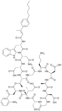 (3S)-3-{[(3S,6S,9R,15S,18R,21S,24S,30S,31R)-3-[2-(2-aminophenyl)-2-oxoethyl]-24-(3-aminopropyl)-15,21-bis(carboxymethyl)-6-[(2R)-1-carboxypropan-2-yl]-9-(hydroxymethyl)-18,31-dimethyl-2,5,8,11,14,17,20,23,26,29-decaoxo-1-oxa-4,7,10,13,16,19,22,25,28-nonaazacyclohentriacontan-30-yl]carbamoyl}-3-[(2R)-3-carbamoyl-2-[(2R)-3-(1H-indol-3-yl)-2-[(2E)-3-(4-pentylphenyl)but-2-enamido]propanamido]propanamido]propanoic acid | |