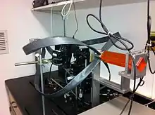 To perform a measurement, the cuvette is filled with the liquid to be investigated and then illuminated with a laser focused through one of the cuvette's faces. A lens is placed in line with one of the faces of the cuvette located at 90° from the input window to collect the laser-induced fluorescent light. Only a small volume of the cuvette is actually illuminated by the laser and produces a detectable spectroscopic emission. The output signal is significantly reduced because the lens picks up only about 10% of the spectroscopic emission due to solid angle considerations. This technique has been used for at least 75 years; even before the laser existed, when conventional light sources were used to excite the fluorescence.[5]
