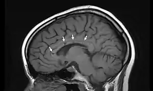 Sagittal T1 image in a 19-year-old woman with Susac's syndrome showing the pathognomonic central callosal "holes" (microinfarcts) of SS. These residual "holes" (and sometimes, "spokes") develop as the acute callosal changes resolve.