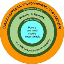 The safe and just space for humanity. Sustainable lifestyles are situated between an upper limit of permissible use (“Environmental ceiling”) and a lower limit of necessary use of environmental resources (“Social foundation”).