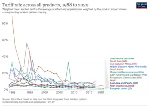 This target has one Indicator: Indicator 17.12.1 is the "Weighted average tariffs faced by developing countries, least developed countries and small island developing States".[7]