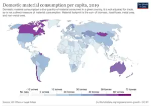 The total material footprint is the sum of the material footprint for biomass, fossil fuels, metal ores and non-metal ores. Data on material footprints are outdated and unavailable after the year 2010.[11] Material footprint per capita has had an increase of 39 per cent from the year 2000 to 2017 reaching 12.18 tonnes and material footprint per unit of GDP has had an increase of 7 percent from the year 2000 to 2017 reaching 1.16 kg.[11]