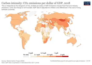 According to a UN progress report from 2020, the "intensity of global carbon dioxide emissions has declined by nearly one quarter since 2000, showing a general decoupling of carbon dioxide emissions from GDP growth".[5]