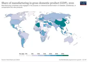 Manufacturing is a major source of employment. In 2016, the least developed countries had less "manufacturing value added per capita." The figure for Europe and North America was US$4,621, compared to about $100 in the least developed countries.[15]