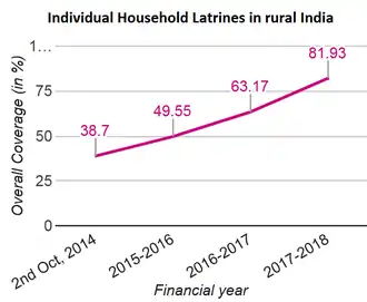 The rural household toilet coverage in India increased from 1% in 1981 to 11% in 1991, to 22% in 2001, to 32.7% in 2011.[41] On 15 August 2014, Prime Minister Narendra Modi from the Red Fort in Delhi called on the public to pay tribute to Mahatma Gandhi on his 150th birth anniversary by devoting a clean India. Narendra Modi was the first Prime Minister to take up the Clean India Movement on a massive scale.[42][43] Before the launch of Swachh India, 38.4% of rural households had toilets in 2013–14, 43.8% in 2014–15, 51.6% in 2015–16, 65.4% in 2016–17, 84.3% in 2017–18, 98.5% in 2018–19, and 98.5% in 2019–20. 100% toilet facility constructed.[44]