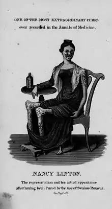 Swaim used a symbol of Hercules killing the Hydra in early advertisements of his product, which was being bottled in rectangular bottles by 1825, and in green cylindrical bottles by 1829.[13] Swaim advertised heavily, and took advantage of developments in commercial lithography in the 1830s to advertise his concoction with a portrait of a woman named Nancy Linton, advertising her "actual appearance" after being cured, although this appearance still looks rather gruesome to modern eyes. The panacea contained mercury, and Linton's appearance appears to reflect signs of mercury poisoning.[14] Mercuric chloride (called corrosive sublimate at the time) did have a prior history of being used to treat syphilis. Oil of wintergreen and sarsaparilla were prominent ingredients of Swaim's product.[15]