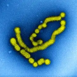 Electron microscope image of the reassorted H1N1 influenza virus photographed at the CDC Influenza Laboratory. The viruses are 80–120 nanometres in diameter.[1] | |