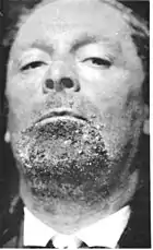 Sycosis vulgaris is a cutaneous condition characterized by a chronic infection of the chin or bearded region.[1]:252[2] The irritation is caused by a deep infection of hair follicles, often by species of Staphylococcus or Propionibacterium bacteria.[3] Asymptomatic or painful and tender erythematous papules and pustules may form around coarse hair in the beard (sycosis barbae) or the back of the neck (sycosis nuchae).