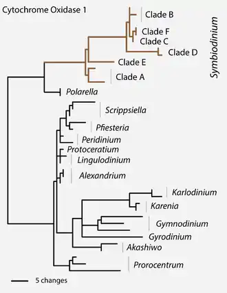 The earliest ribosomal gene sequence data indicated that Symbiodinium had lineages whose genetic divergence was similar to that seen in other dinoflagellates from different genera, families, and even orders.[36] This large phylogenetic disparity among clades A, B, C, etc. was confirmed by analyses of the sequences of the mitochondrial gene coding for cytochrome c oxidase subunit I (CO1) among Dinophyceae.[37] Most of these clade groupings comprise numerous reproductively isolated, genetically distinct lineages (see ‘Species diversity’), exhibiting different ecological and biogeographic distributions (see ‘Geographic distributions and patterns of ‘diversity’).