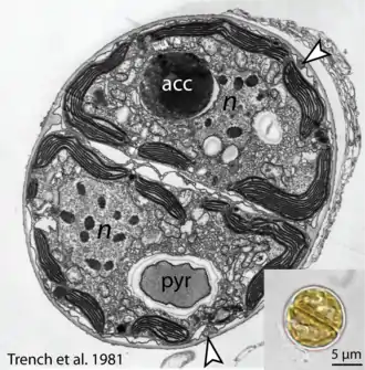 - ↑ Schoenberg, D. A.; Trench, R. K. (1980). "Genetic Variation in Symbiodinium (=Gymnodinium) microadriaticum Freudenthal, and Specificity in its Symbiosis with Marine Invertebrates. II. Morphological Variation in Symbiodinium microadriaticum". Proceedings of the Royal Society B: Biological Sciences. 207 (1169): 429–44. Bibcode:1980RSPSB.207..429S. doi:10.1098/rspb.1980.0032. JSTOR 35363. S2CID 84395179.